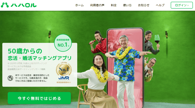 ハハロルは、50代からのパートナー探しに特化したマッチングアプリです。若い世代が中心のアプリに抵抗がある層から、今大きな注目を集めています。
