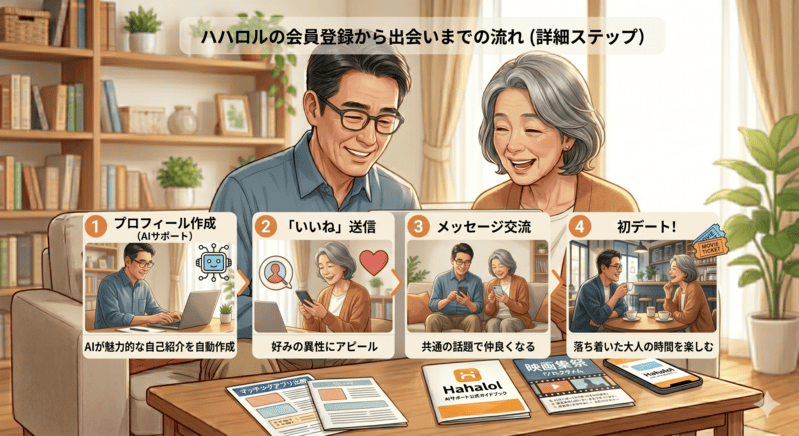 ここからは、ハハロルで実際にパートナーと出会うまでの具体的な流れを解説します。50代以上の方に特化したサービスだからこそ、シンプルでわかりやすいステップになっているのが特徴です。
