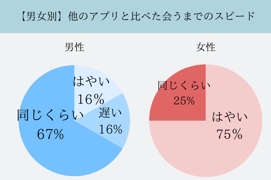 男性に「同じくらい」が多かった原因として、マッチングまでのスピードが関係するかもしれません。Dineでは「マッチング=デート」であるため、女性もマッチングに慎重になりがちです。そのため、マッチング数の母数が減り、結果的にデートまでに長さは同じくらいと感じた人が多いと思いました。