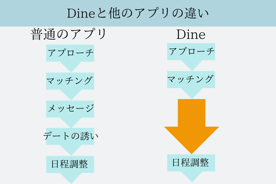 一方で、Dineではメッセージ・デートのお誘い・日程調整といったステップを省くことで手軽にデートに行くことができます。