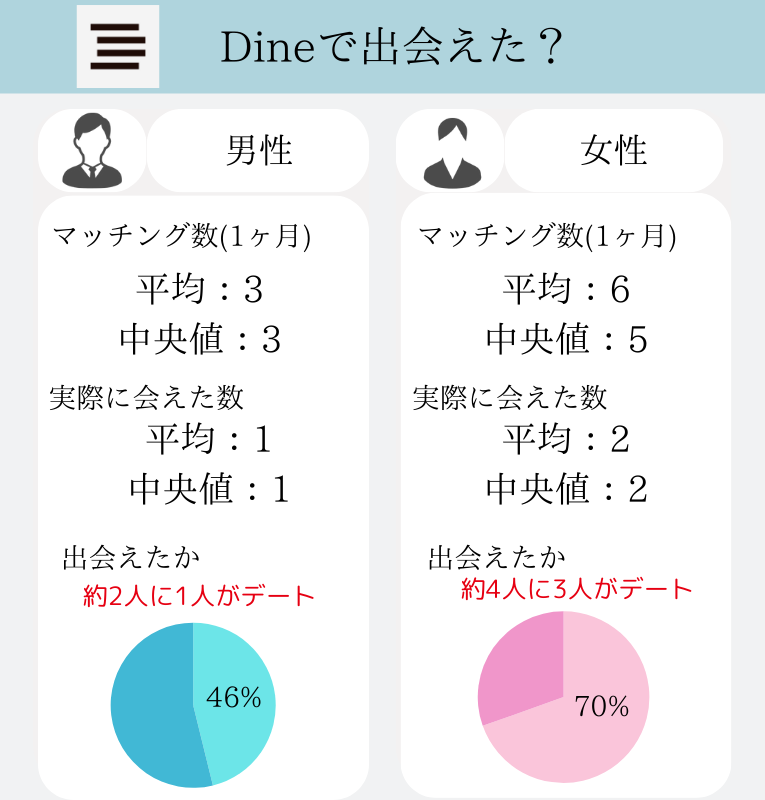Dineの平均マッチング数は、男性が3人、女性が6人となりました。中央値は男性が3人、女性が5人でした。