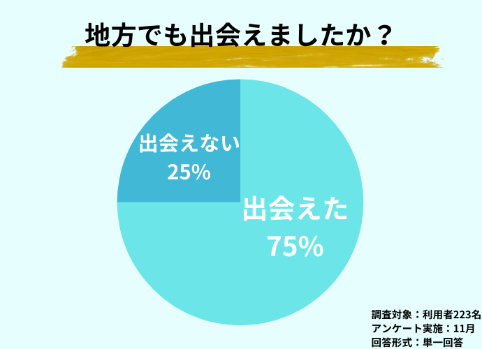 実際にアンケートにおいて地方在住の223名に「ペアーズでは地方在住でも出会えると感じますか?」という問をしたところ75%が「はい」と回答しており、地方在住のペアーズ利用者は特に住む場所によって出会いの数に不満を持っていないことがわかりました。