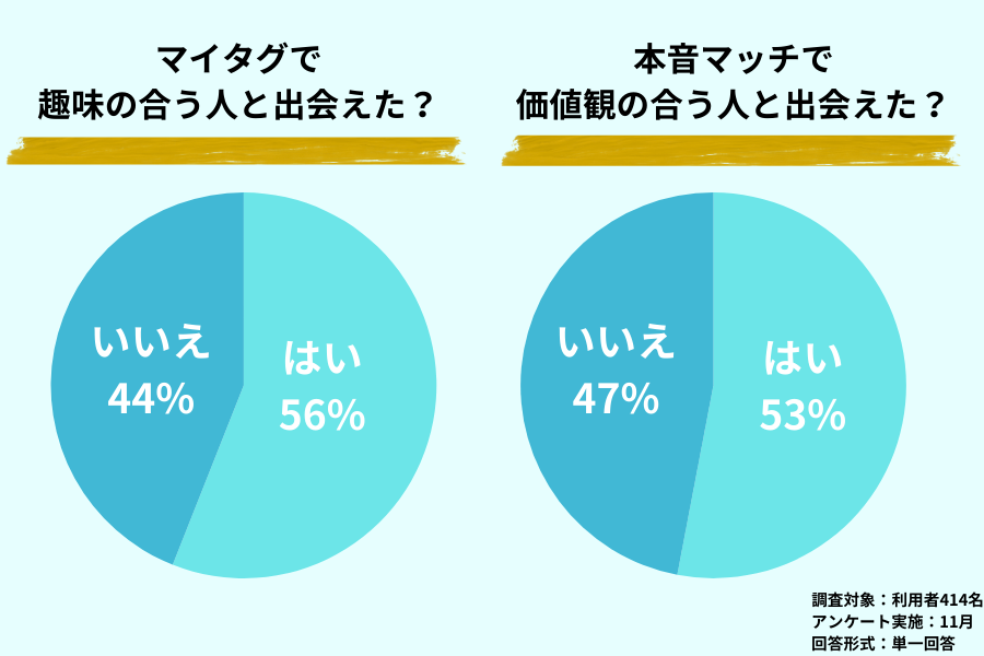 という問をしたところ、マイタグに関しては56%、本音マッチに関しては53%が「はい」と回答しており、ペアーズの機能の有効性を確認することができました。