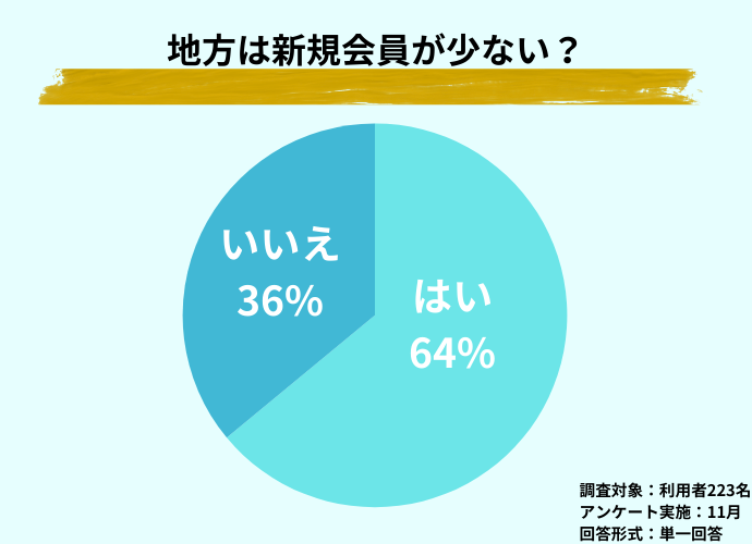 地方在住者の男女223名にとったアンケートでは、「地方では新規登録者が少ないと感じたことはありますか? 」という問に対して、