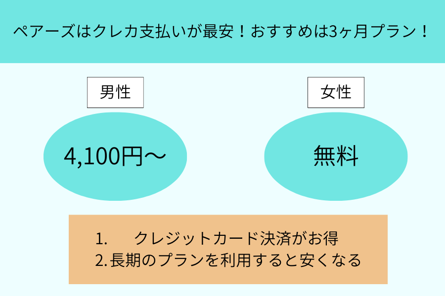 次は料金プランについてです。ペアーズは女性は基本的に無料で利用できますが、男性は料金がかかります。男性の料金は1ヶ月4,100円~です。ペアーズの支払い方法は主に3つで、ブラウザ版のクレジットカード決済、Apple ID決済、Google Play決済が利用できます。