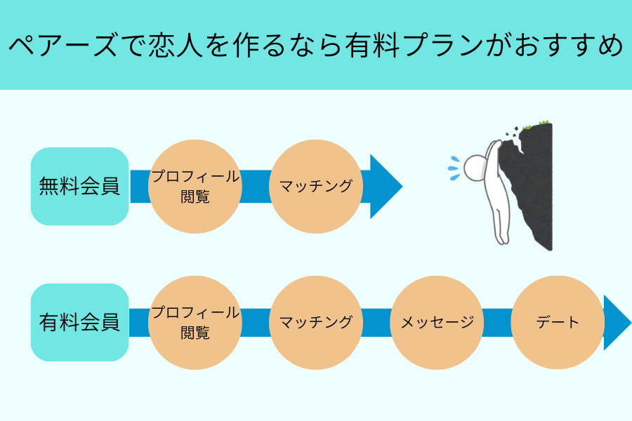 男性がペアーズで恋人を作りたい場合は、有料プランになるのがおすすめです。ペアーズは、実際に出会うまでの機会を作ってくれるアプリです。