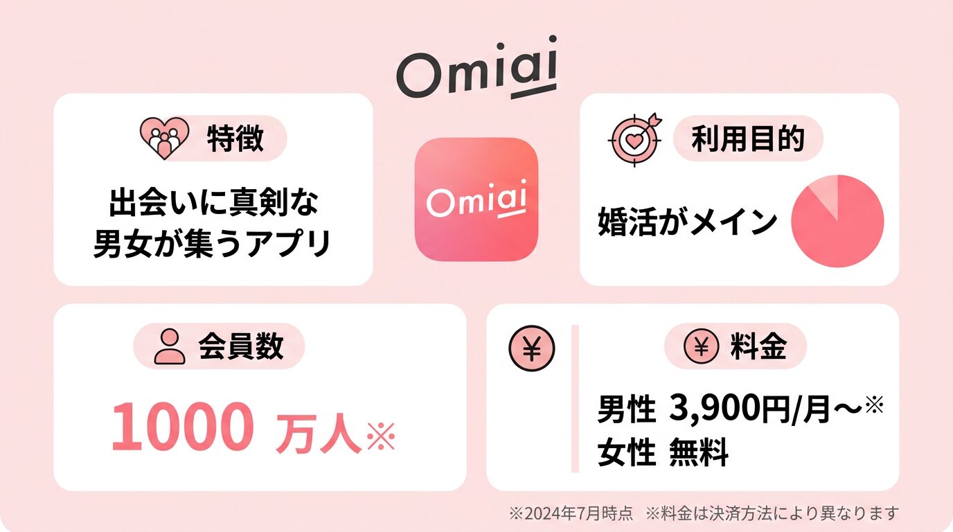 ![]() ![]() ![]() Omiai | 真剣度が高く誠実な層が多く、結婚を見据えた出会いが可能 |