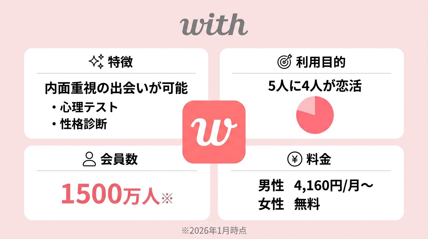 | 1位 with | ・内面重視の出会いを実現 ・恋活の真剣度高め ・学生数が多い | インストール 詳細情報へ |