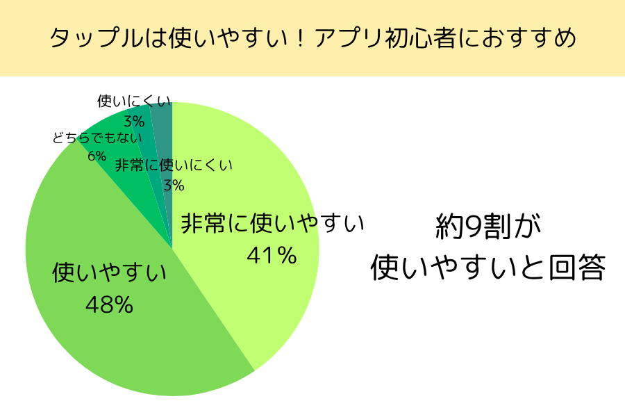 タップルはマッチングアプリを初めて使う人にもおすすめです。110人へのアンケートの結果、約9割がタップルを使いやすいと回答しており、タップルがマッチングアプリ初心者でも使いやすいアプリであることがわかります。
