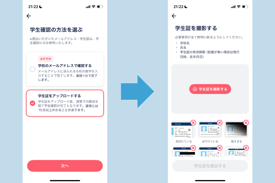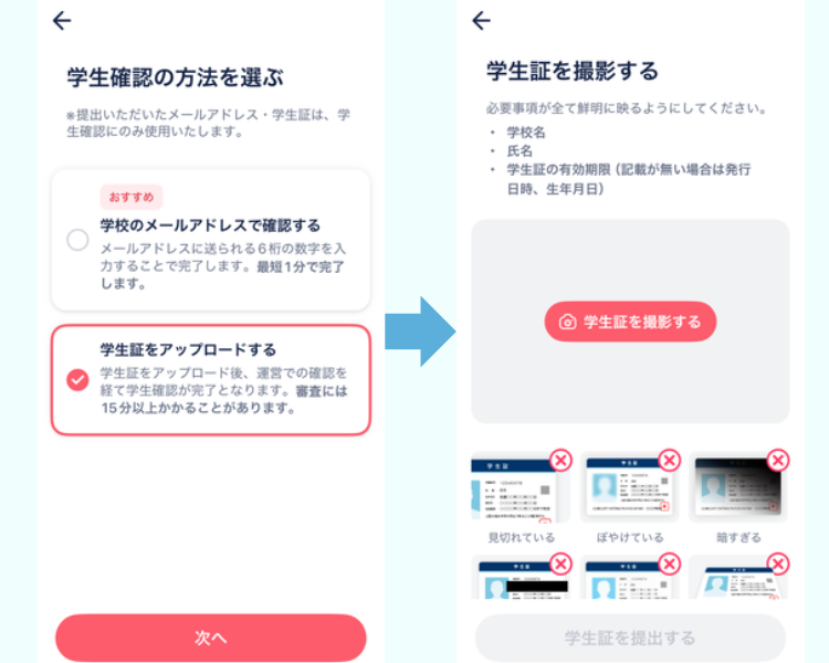 - 「学校名」「氏名」「有効期限(記載がない場合は発行日時、生年月日)」の3点が鮮明に映るようにして学生証を撮影し、提出