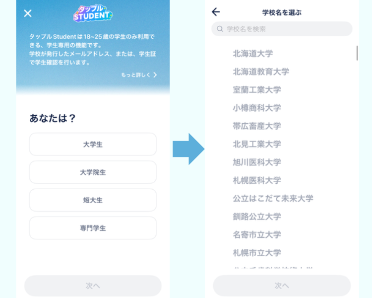 まず学校の属性を選択します。「大学生」、「大学院生」、「短大生」、「専門学生」の内の1つを選びます。その後、学校名を選びます。