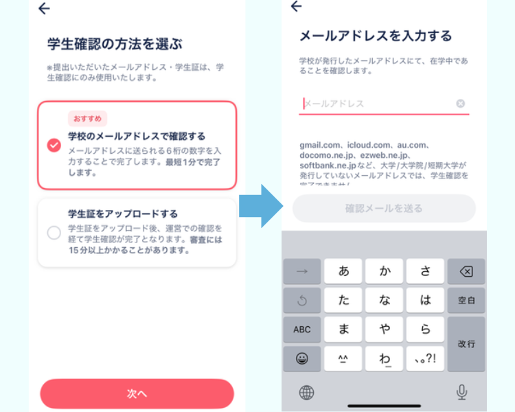 - 大学/大学院/短大が発行したメールアドレスを入力