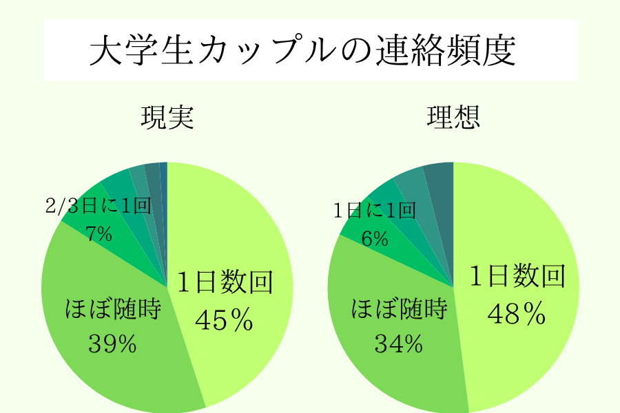 今回はカップルのデート・連絡頻度について調査しました。大学生100人にアンケートをとったところ、デートの頻度は週1~2回が最多、連絡頻度は1日数回が最多となりました。