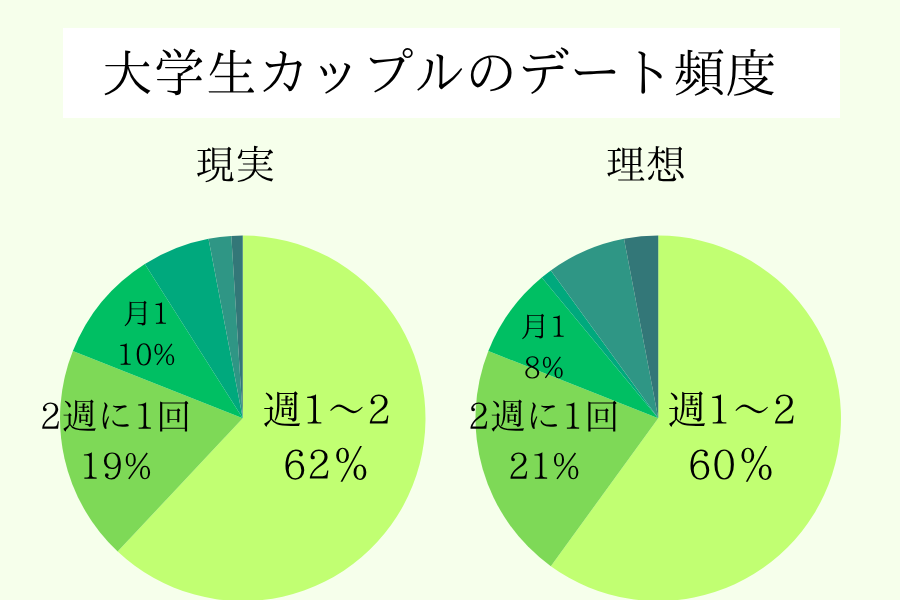 それでは実際に大学生カップルのデートの頻度を見ていきましょう。今回は実際の頻度と、大学生が望む理想のデートの頻度も調査しました。