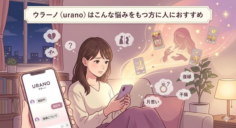 ウラーノ(urano)は、24時間いつでもチャットで気軽に恋愛相談ができる占いアプリです。複雑な恋愛や復縁、はたまた不倫やセックスレスなど、幅広い恋愛の悩みを相談できます。